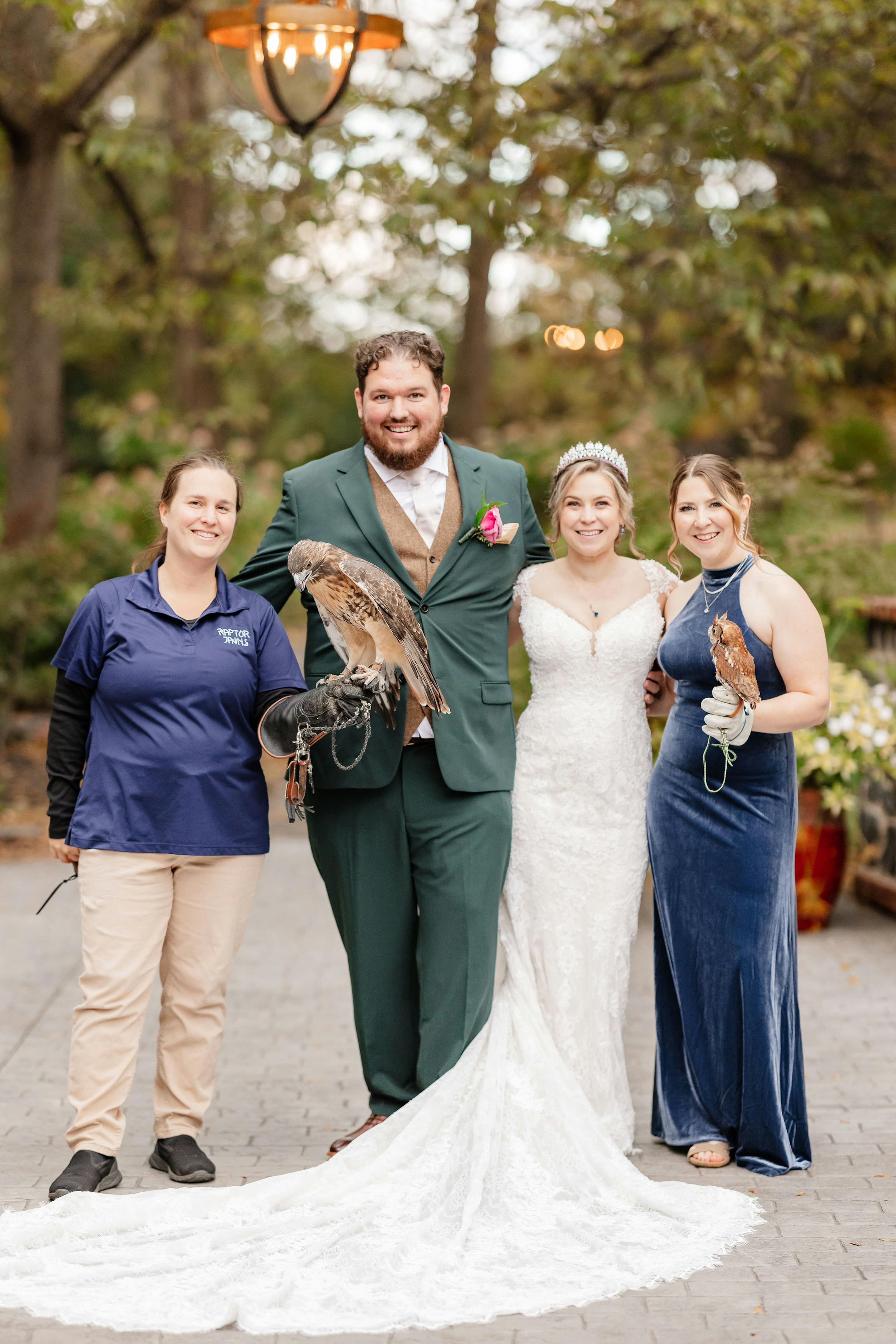 Dan and Stef highlighted their passion for their favorite sports team on their wedding day, too. In an ode to the Philadelphia Eagles, the couple brought in some other raptors to help them celebrate. An owl and a hawk to take photos with kept the wedding reception exciting, but that wasn't the end of the Eagles love. To end the night, Dan and Stef added football jerseys over their outfits to make a statement during their wedding exit sparklers.