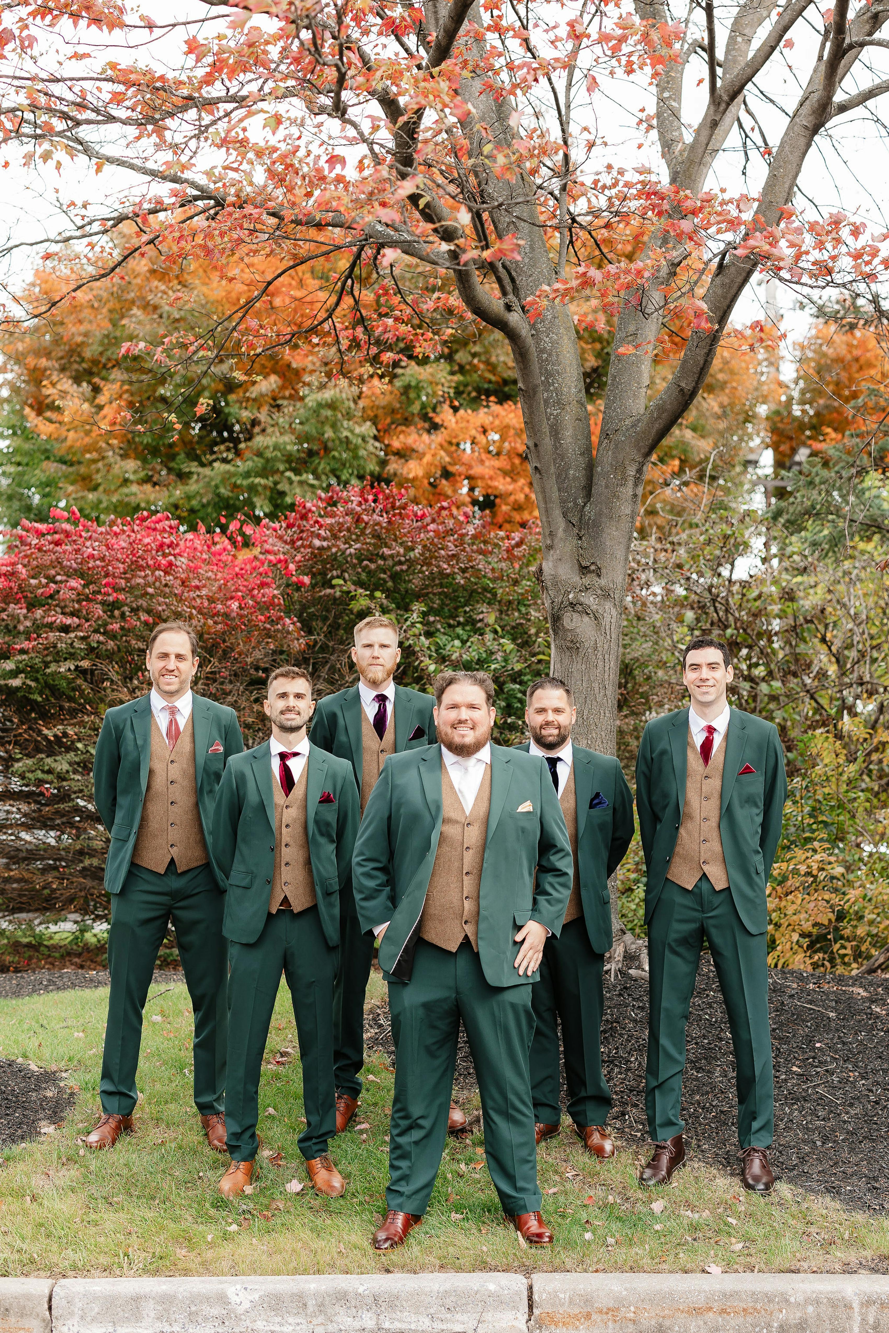 The wedding party's outfits played a big part in defining and reinforcing Dan and Stef's wedding color palette. The bridesmaids wore mix and match velvet dresses in varied jewel tones, from rust to burgundy, deep blue, and eggplant. The range of shades did a beautiful joy mirroring the fall colors of the leaves while adding in the other, coordinating shades in the couple's wedding color scheme. The groomsmen sported a similar suit look to Dan, wearing green suits with brown tweed suit vests underneath. Instead of echoing the white-on-white shirt and tie look from Dan's outfit, though, the groomsmen each wore different bold tie colors in jewel tones to match the bridesmaids.