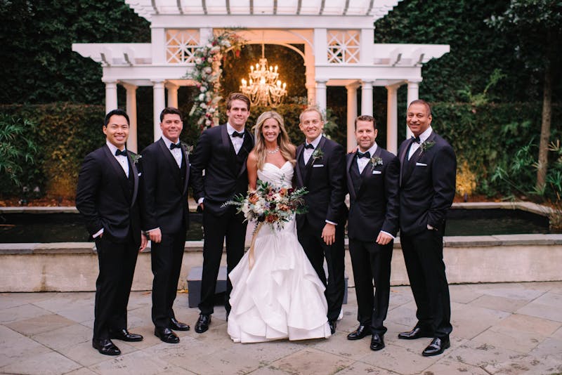 Robert and Kristen created a romantic wedding style for their magical Charleston, SC wedding. The groomsmen are sporting our premium black shawl lapel tuxedos for an elegant winter wedding look, while the groom stands out in his own custom tuxedo.